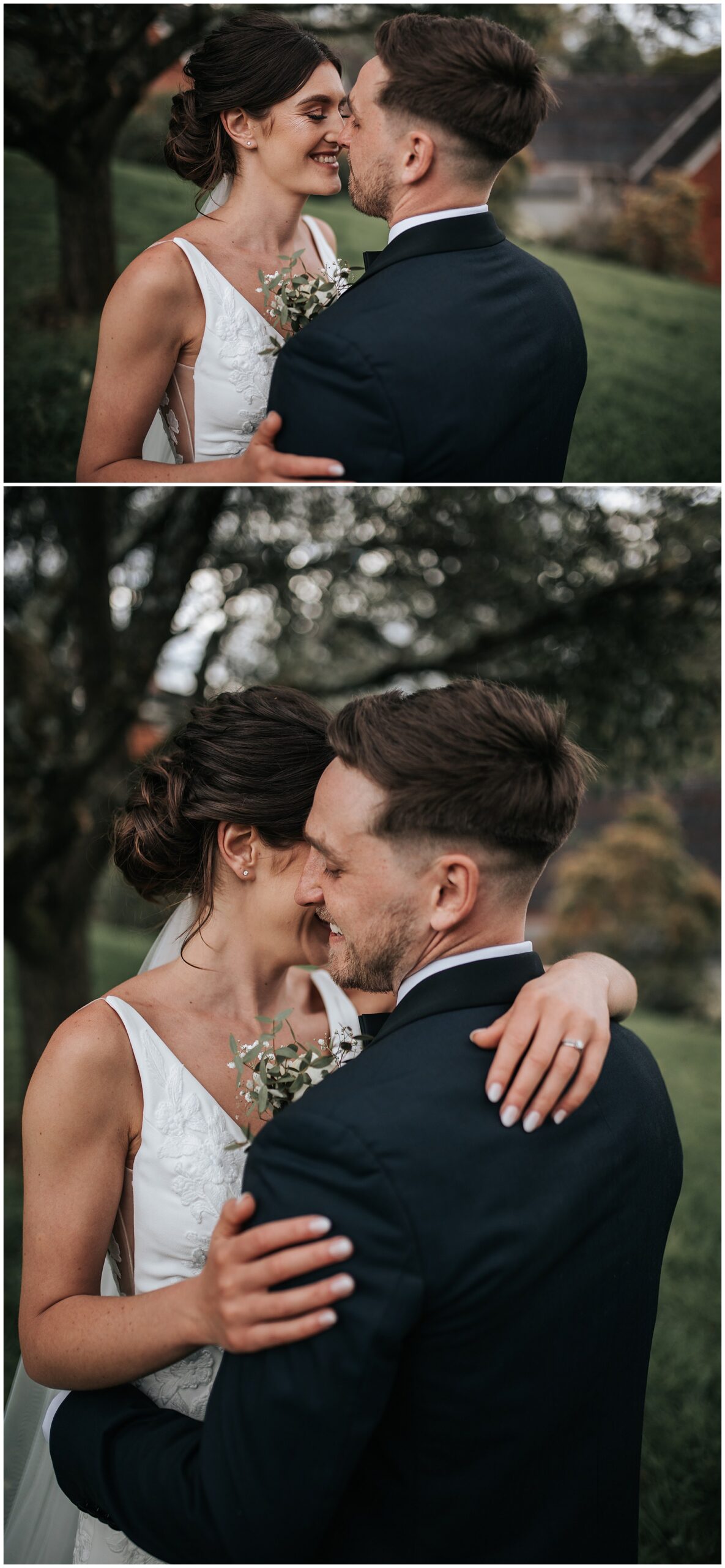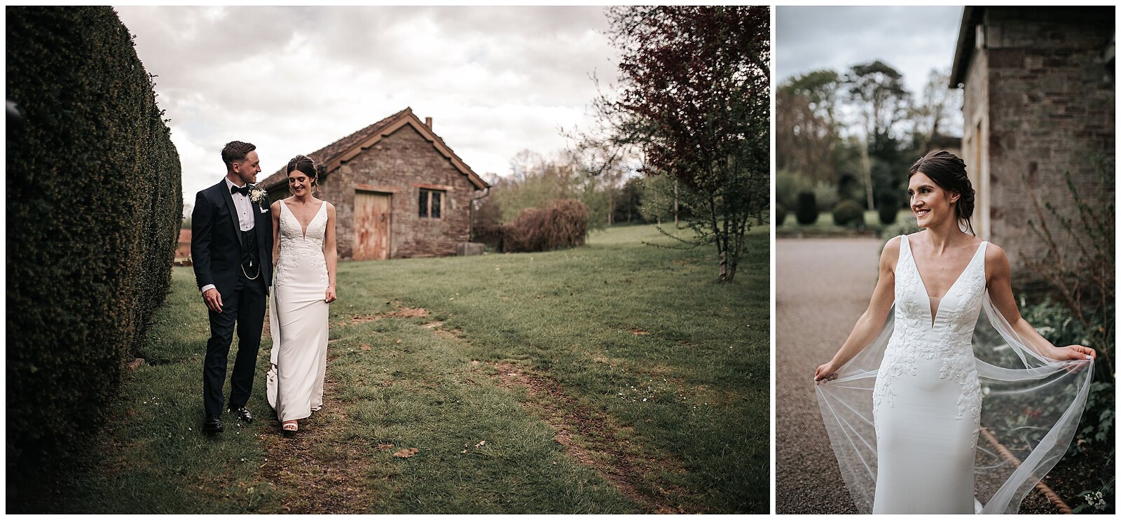 The weather was lovely so guests mingled in the gardens, and after the couple had a chance to have a catch up with their guests, we took some family group photos. Then I headed out with Amy & Brad for a walk around the grounds of Cefn Tilla Court, while taking some intimate photos of the two of them. After some food and speeches, the lighting outside had become a lot softer since we now had cloud cover. This is perfect for flattering soft lighting. I always keep an eye on the lighting throughout the day to catch moments like this. Including later in the evening where I could see it was looking like we were going to have a sunset and beautiful golden light. I asked Amy & Brad if they’d like to go out after the first dance, which they did. We quickly headed out over to an area I know really catches the light. It doesn’t take long to capture these moments, and it means you get a good variety throughout the day.